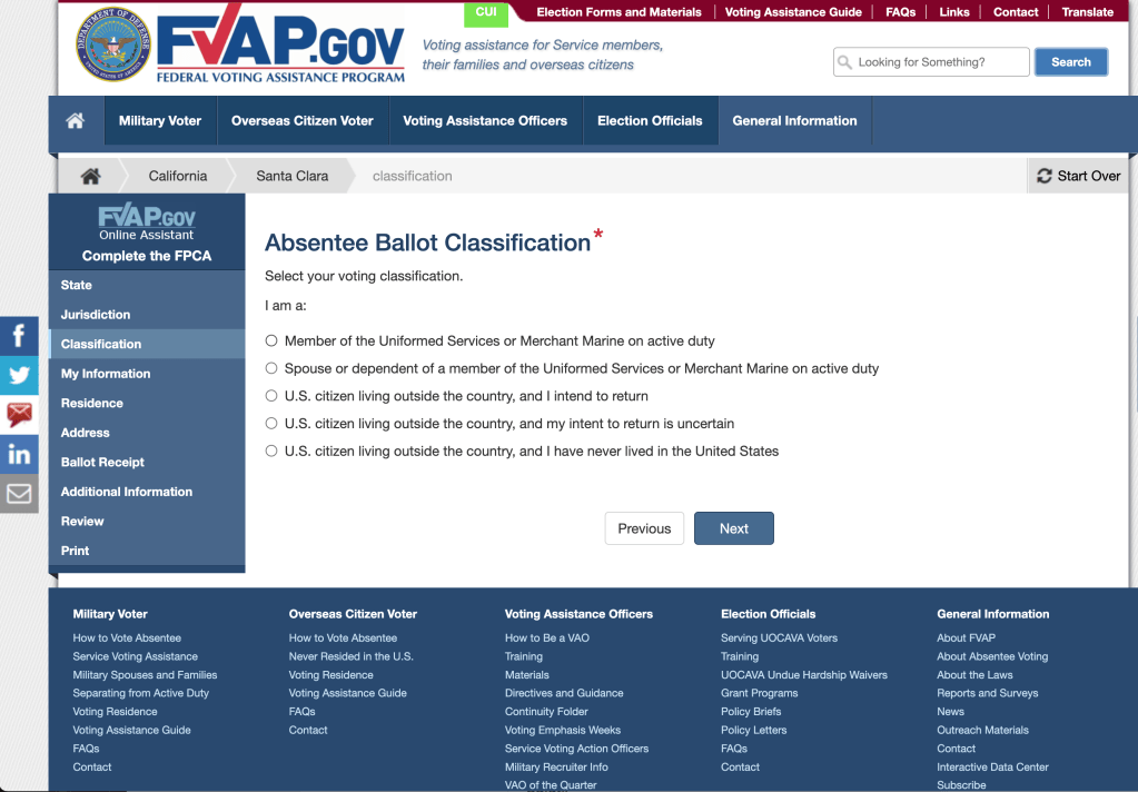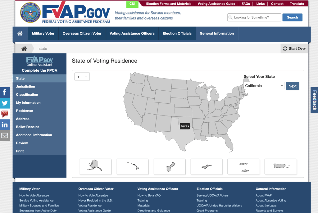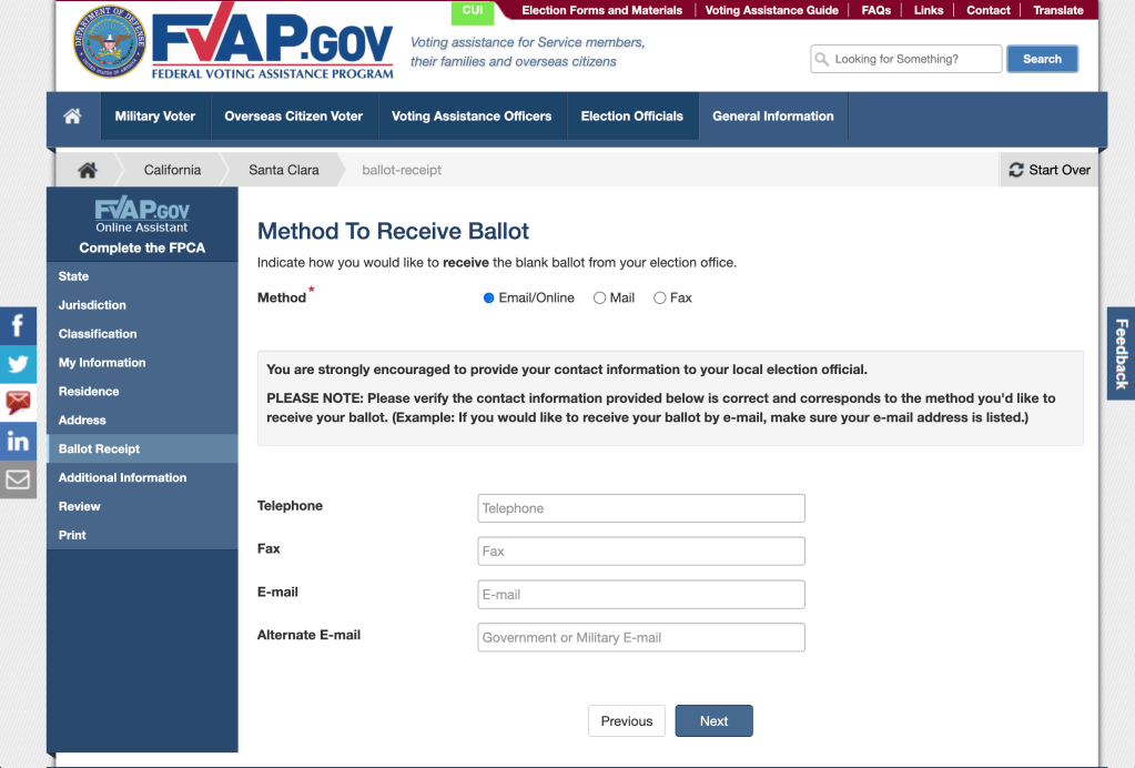 First, head over to the Federal Voting Assistance Program website, which will ask you to fill out a few forms, afterwards it will generate a PDF that you will have to send by email to your county Registrar of Voters’ Office.